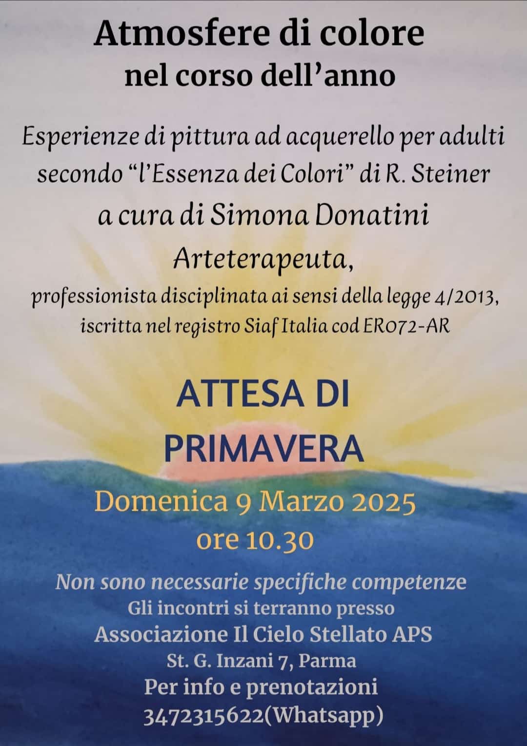 Esperienza di pittura ad acquerello secondo ” l’Essenza dei colori” di R.Steiner, a cura di Simona Donatini Arteterapeuta, professionista disciplinata ai sensi della legge 4/2013, iscritta nel registro Siaf Italia cod ERO72-AR